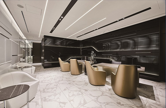 さまざまな文化が融合し、トレンド発信地でもある六本木。 そんな街からインスピレーションを受けた空間コンセプトは「ROPPONGI NEW MODERN」。素材の重なりと照明による演出で、先進性と落ち着きを併せ持つ空間を創り出しています。